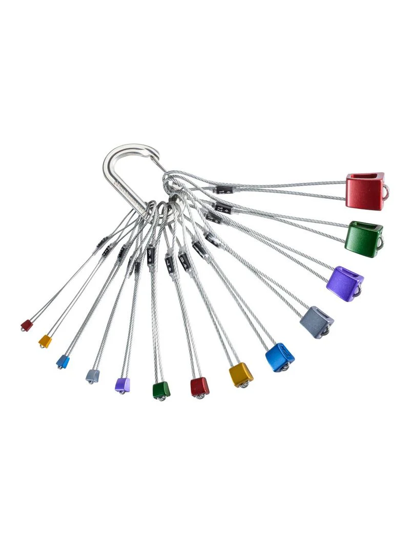 Stoppers No. 1-13 racked on an OvalWire carabiner. Black Diamond Stoppers are an essential for every trad rack, designed with a transverse taper that permits sideways placements in flares and shallow seams. Anodized by size, they're quickly identifiable and rounded edges make for easy removal. Each Stopper is equipped with a durable, galvanized steel cable.