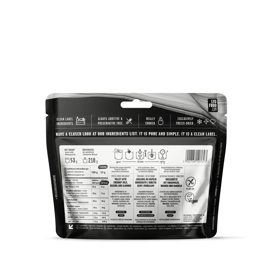 Ingredients of ready-to-use product: millet 50 %, coconut milk 34 %, jaggery sugar, raisins (raisins, sunflower oil),almonds, cardamom, salt, cinnamon.