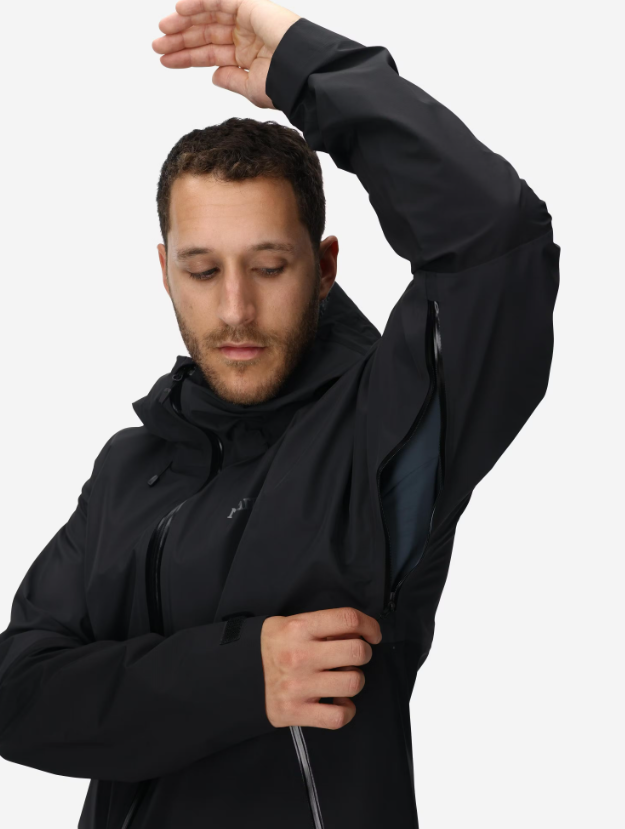 Features include an adjustable helmet-compatible hood, waterproof zippers, pit zips for ventilation, and zippered pockets accessible while wearing a backpack or harness. Its lightweight construction makes it easy to pack and carry.