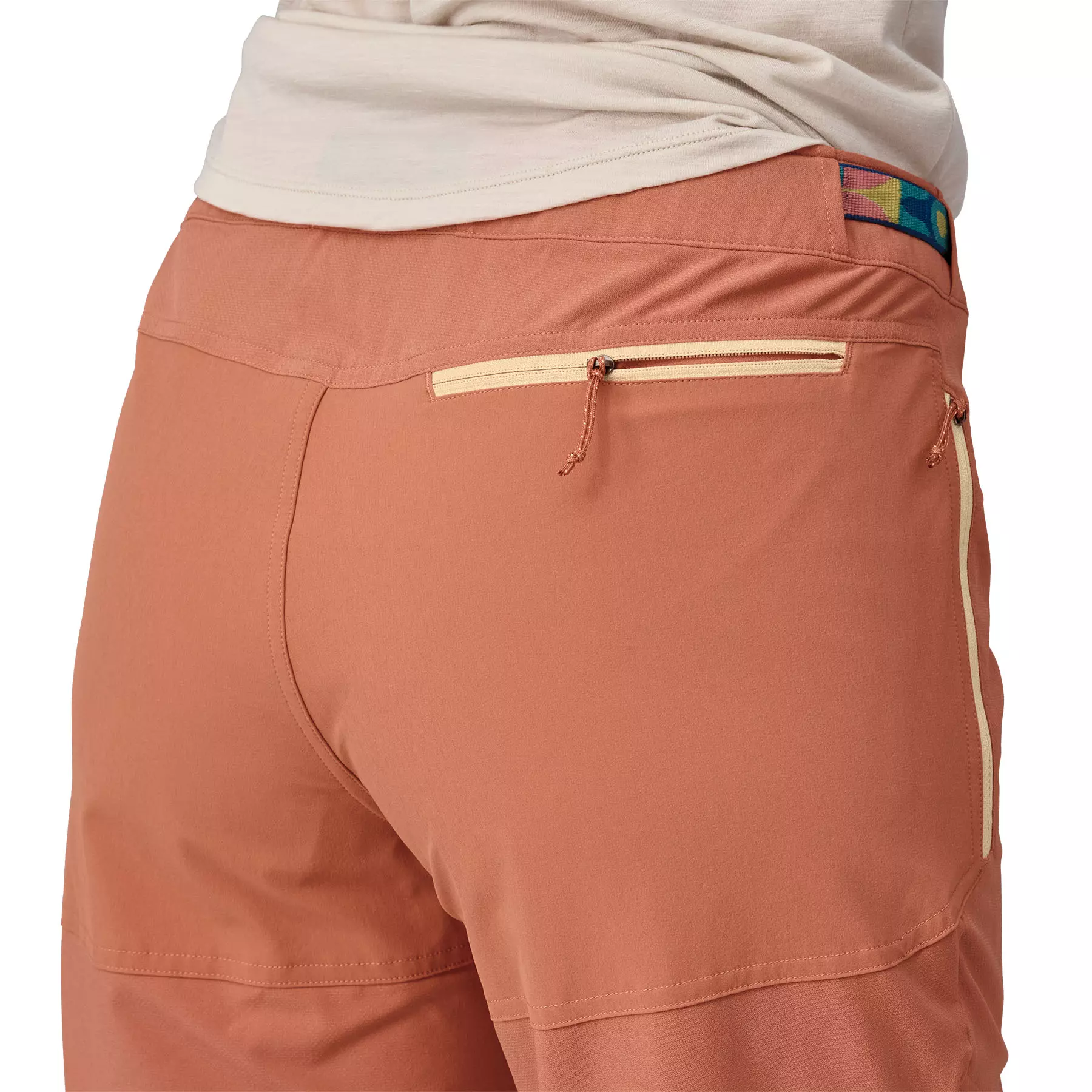 Low-profile waistband with separating zip fly and integrated adjustable belt ensures precise fit and stays comfortable under a harness or a backpack waistbelt