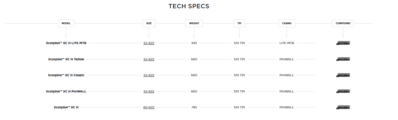 Designed for hardpacked cross-country and marathon courses: the best trade-off between speed and grip. Low profile and compact tread pattern for riding quickly and confidently over hardpack terrain. The Scorpion™ XC H is the preferred choice for XC and marathon courses where speed is the key factor